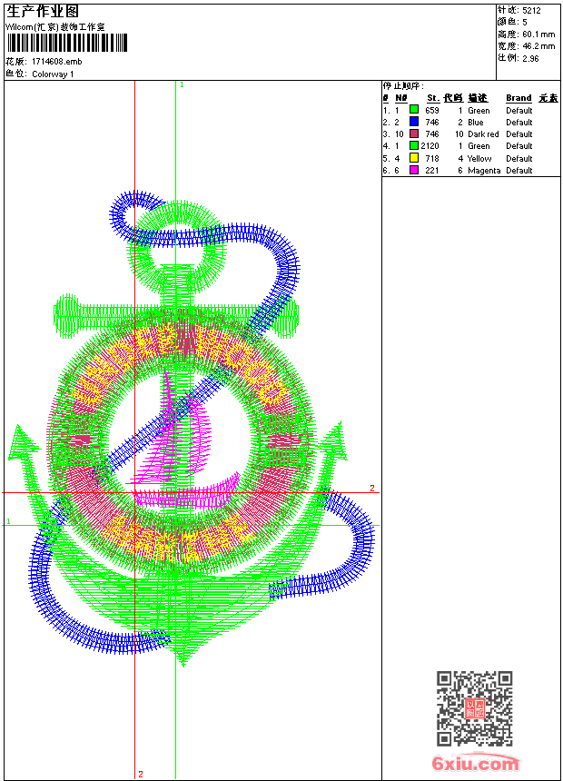 - emb花版参数: 大小:43.50 KB / 尺寸:46*60[毫米] / 针数:5212针 / 线色:5 / 格式:emb / 版本:7