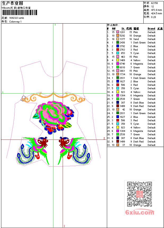凤凰牡丹花吉祥 点此上传花版兑乐绣币/现金 emb花版参数: 大小:286.00 KB / 尺寸:424*474[毫米] / 针数:62158针 / 线色:12 / 格式:emb / 版本:9 版带文件需绣花软件方可打开,可配色打印导出各种格式或直接上机绣。如无绣花软件可下载1:1模拟效果图。 PNG图片信息:大小:0.9 (MB) /图宽*高:1606x1792(像素) 上传作者( *** ) 获得乐绣币:1个 emb下载 1:1图下载 关闭 相似花型推荐: 凤凰-吉祥 牡丹花传统 凤凰珠片动物 豹动物 凤凰珠片鸟动物 抽象几何匹绣裤 虎头动物 鸟语花香唐装衣民族 虎动物 鱼珠片吉祥传统 凤凰-吉祥 猫头鹰贴布动物 鹰皇冠胸章男装 花-抽象立体包针花朵 孔雀珠片鸟 上一个花样:龙凤凰动物吉祥唐装 下一个花样:凤凰-吉祥