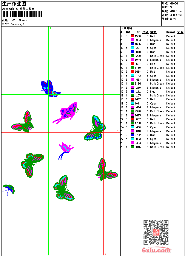 满天蝴蝶 点此上传花版兑乐绣币/现金 emb花版参数: 大小:229.00 KB / 尺寸:400*418[毫米] / 针数:41004针 / 线色:5 / 格式:emb / 版本:2006 版带文件需绣花软件方可打开,可配色打印导出各种格式或直接上机绣。如无绣花软件可下载1:1模拟效果图。 PNG图片信息:大小:0.8 (MB) /图宽*高:1515x1583(像素) 上传作者( jinh*** ) 获得乐绣币:个 emb下载 1:1图下载 关闭 相似花型推荐: 鸟语花香 腾龙 左右手 孔雀 人物头像 抽象 鸟吉祥树枝 珠片大嘴 凤凰 观音-精品 love嘴唇 前幅花样 龙凤吉祥 墙壁挂画--龙 凤凰 凤凰 上一个花样:老虎 下一个花样:鸟语花香