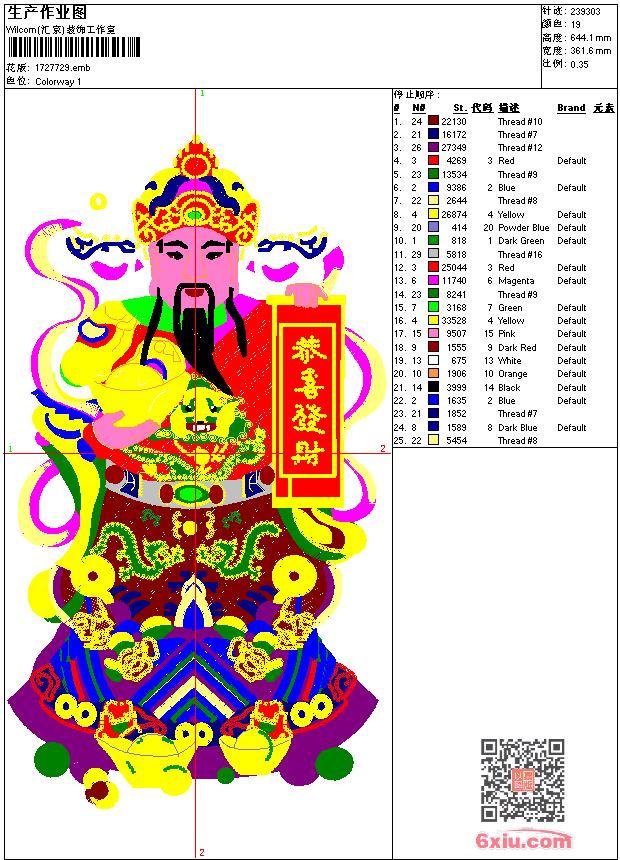 人物-财神像-恭喜发财-工艺精品 点此上传花版兑乐绣币/现金 emb花版参数: 大小:809.50 KB / 尺寸:362*644[毫米] / 针数:239303针 / 线色:19 / 格式:emb / 版本:2006 版带文件需绣花软件方可打开,可配色打印导出各种格式或直接上机绣。如无绣花软件可下载1:1模拟效果图。 PNG图片信息:大小:5.1 (MB) /图宽*高:1368x2437(像素) 上传作者( 吹泡*** ) 获得乐绣币:50个 emb下载 1:1图下载 关闭 相似花型推荐: 米奇 米老鼠 复杂地毯工艺精品 山水人家风景工艺精品 葡萄花工艺精品 鸟工艺精品 鹰美国国旗 直升飞机 马苹果 武士帽 外国警察徽章 豹头 章仔 凤凰 米奇-米老鼠 鸟 上一个花样:马头 下一个花样:米奇 米老鼠