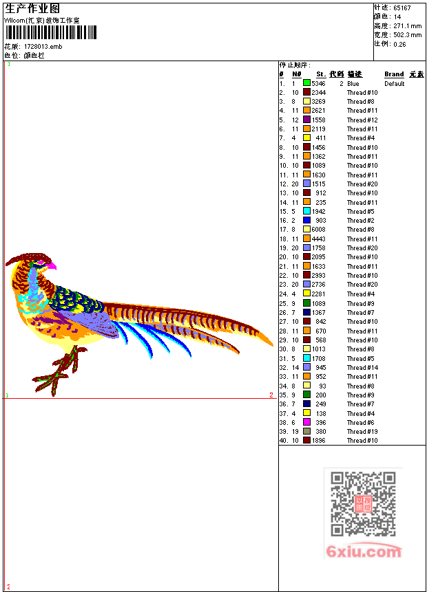 山鸡 点此上传花版兑乐绣币/现金 emb花版参数: 大小:315.50 KB / 尺寸:502*271[毫米] / 针数:65167针 / 线色:14 / 格式:emb / 版本:9 版带文件需绣花软件方可打开,可配色打印导出各种格式或直接上机绣。如无绣花软件可下载1:1模拟效果图。 PNG图片信息:大小:1.3 (MB) /图宽*高:1900x1026(像素) 上传作者( 魏有*** ) 获得乐绣币:120个 emb下载 1:1图下载 关闭 相似花型推荐: 海螺 抱枕 树 抱枕 大树 鱼-年年有余 鲤鱼 吉祥 中国风 抱枕 钥匙 人物-快乐之道工艺精品 孔雀工艺精品 马-海马抱枕-家纺 树-摇钱树-家纺 鹤-松鹤富贵图-工艺精品 龙 吉祥-金蟾 虎-老虎 鸡 -公鸡 人物-美女 鹰-大鹏展翅 上一个花样:鸟 喜鹊 中国风 吉祥 抱枕 下一个花样:海螺 抱枕