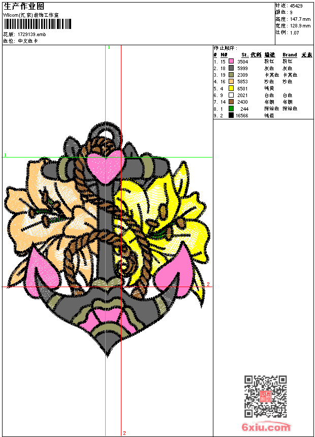 锚-章仔 点此上传花版兑乐绣币/现金 emb花版参数: 大小:2.68 MB / 尺寸:129*148[毫米] / 针数:45429针 / 线色:9 / 格式:emb / 版本:9 版带文件需绣花软件方可打开,可配色打印导出各种格式或直接上机绣。如无绣花软件可下载1:1模拟效果图。 PNG图片信息:大小:0.4 (MB) /图宽*高:488x559(像素) 上传作者( 1887*** ) 获得乐绣币:20个 emb下载 1:1图下载 关闭 相似花型推荐: 鱼-鲤鱼图-工艺精品 珠片-衣领-多色金片绣 领绣-水溶-衣领 花-家纺花-芍药大花 人物-四大美女-琵琶女-昭君出塞 骷髅头与宝剑 龙-飞龙在天 珠片字母-lame-服装胸前大号双色亮片 珠片-眼睛-服装 眼镜 春夏秋冬[春]工艺精品-牡丹花-鸟 梅兰竹菊-竹工艺精品 梅兰竹菊-竹工艺精品 梅兰竹菊-菊工艺精品 龙-双龙福工艺精品 字画-诚信工艺精品 上一个花样:锚-章仔 下一个花样:鱼-鲤鱼图-工艺精品