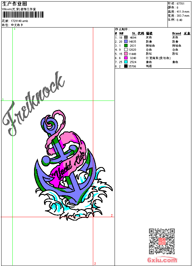 锚-章仔 点此上传花版兑乐绣币/现金 emb花版参数: 大小:251.50 KB / 尺寸:304*412[毫米] / 针数:87701针 / 线色:8 / 格式:emb / 版本:9 版带文件需绣花软件方可打开,可配色打印导出各种格式或直接上机绣。如无绣花软件可下载1:1模拟效果图。 PNG图片信息:大小:1.4 (MB) /图宽*高:1149x1559(像素) 上传作者( 1887*** ) 获得乐绣币:5个 emb下载 1:1图下载 关闭 相似花型推荐: 锚-章仔 鱼-鲤鱼图-工艺精品 珠片-衣领-多色金片绣 领绣-水溶-衣领 花-家纺花-芍药大花 人物-四大美女-琵琶女-昭君出塞 骷髅头与宝剑 龙-飞龙在天 珠片字母-lame-服装胸前大号双色亮片 珠片-眼睛-服装 眼镜 春夏秋冬[春]工艺精品-牡丹花-鸟 梅兰竹菊-竹工艺精品 梅兰竹菊-竹工艺精品 梅兰竹菊-菊工艺精品 龙-双龙福工艺精品 上一个花样: 虎-跳跳虎-后背老虎-童装卡通 下一个花样:锚-章仔
