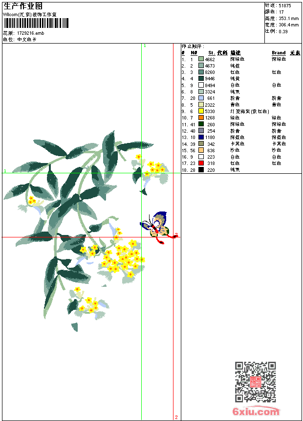 花-蝴蝶-中国风 点此上传花版兑乐绣币/现金 emb花版参数: 大小:450.00 KB / 尺寸:306*353[毫米] / 针数:51875针 / 线色:17 / 格式:emb / 版本:7 版带文件需绣花软件方可打开,可配色打印导出各种格式或直接上机绣。如无绣花软件可下载1:1模拟效果图。 PNG图片信息:大小:1.2 (MB) /图宽*高:1159x1336(像素) 上传作者( 冰心*** ) 获得乐绣币:30个 emb下载 1:1图下载 关闭 相似花型推荐: 马-珠片-亮片五色马 风景-江南水乡工艺精品-桥-船 虎-老虎工艺精品 龙球工艺精品 龙年大吉工艺精品 猫-黑猫章仔-贴布童装 鳄鱼章仔-童装 眼镜-T恤-风衣-面具 虎-跳跳虎-后背老虎-童装卡通 虎-跳跳虎-后背老虎-童装卡通 锚-章仔 锚-章仔 鱼-鲤鱼图-工艺精品 珠片-衣领-多色金片绣 领绣-水溶-衣领 上一个花样:狼头工艺精品 下一个花样:马-珠片-亮片五色马