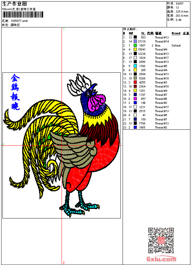 鸡 金鸡报晓 大公鸡 精品 点此上传花版兑乐绣币/现金 emb花版参数: 大小:428.50 KB / 尺寸:264*326[毫米] / 针数:93057针 / 线色:13 / 格式:emb / 版本:9 版带文件需绣花软件方可打开,可配色打印导出各种格式或直接上机绣。如无绣花软件可下载1:1模拟效果图。 PNG图片信息:大小:1.6 (MB) /图宽*高:997x1233(像素) 上传作者( 魏有*** ) 获得乐绣币:80个 emb下载 1:1图下载 关闭 相似花型推荐: 风景-威尼斯-水乡精品船乱针绣 船- 字画 一帆风顺_鼓励版-精品 帆船-精品 玫瑰花-乱针绣精品 景色 沧海腾龙 长城山河 鸿运当头 精品工艺 樱花 插针 鸟 玫瑰花 章 风衣 男装 鲤鱼 吉祥 中国风 唐装 风景别墅山庄 精品 马 两只斑马 乱针绣精品 人物 圣母玛利亚 乱针绣精品 风景 冬季公园 乱针绣精品 鸡 金鸡报晓 大公鸡 精品 牡丹花-碧玉清风-精品-中国风 玫瑰花-粉红玫瑰(十字绣)-精品 上一个花样:玫瑰花 情人节_valentine 2017 精品 字母 下一个花样:风景-威尼斯-水乡精品船乱针绣