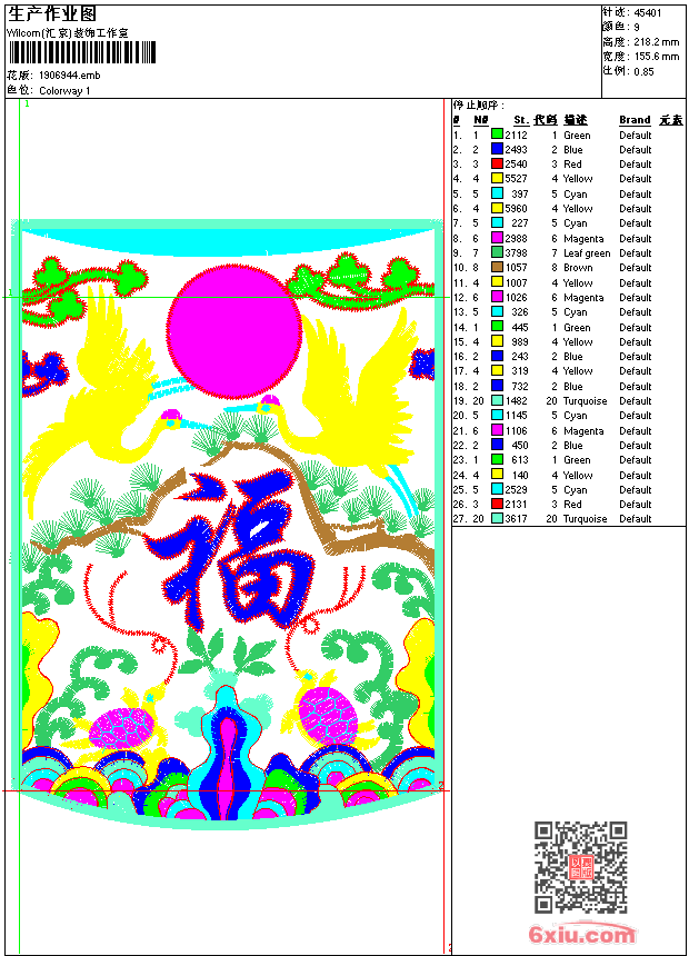 福 仙鹤 龟 梅花 古典 唐装 中国风 传统 点此上传花版兑乐绣币/现金 emb花版参数: 大小:249.50 KB / 尺寸:156*218[毫米] / 针数:45401针 / 线色:9 / 格式:emb / 版本:7 版带文件需绣花软件方可打开,可配色打印导出各种格式或直接上机绣。如无绣花软件可下载1:1模拟效果图。 PNG图片信息:大小:0.7 (MB) /图宽*高:589x826(像素) 上传作者( yhr5*** ) 获得乐绣币:100个 emb下载 1:1图下载 关闭 相似花型推荐: 牡丹花蝴蝶 中国风唐装 旗袍 梅花 报春图工艺精品 鹰头 章标 匹绣 皮 背景墙纸 毛巾绣 草莓 NBA 章 篮球 logo 人物 圣母玛利亚 圣经 宗教 牛仔服后背 紫色花 抽象 装饰 蝴蝶花 装饰 玫瑰花 凤凰 吉祥 中国风 鸟 羽毛 动物 豹子头 动物 花 中国风 菊花 曲线 抽象 中国传统 如意 上一个花样:抱枕牡丹花朵和古树 抱枕 中国风 下一个花样:牡丹花蝴蝶 中国风唐装 旗袍
