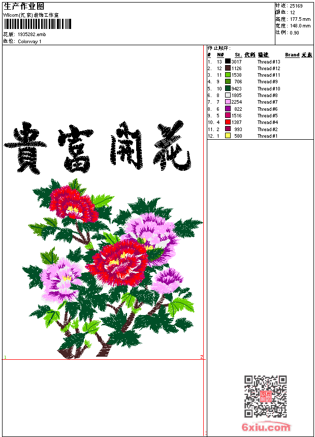 - emb花版参数: 大小:231.00 KB / 尺寸:148*178[毫米] / 针数:25169针 / 线色:12 / 格式:emb / 版本:9