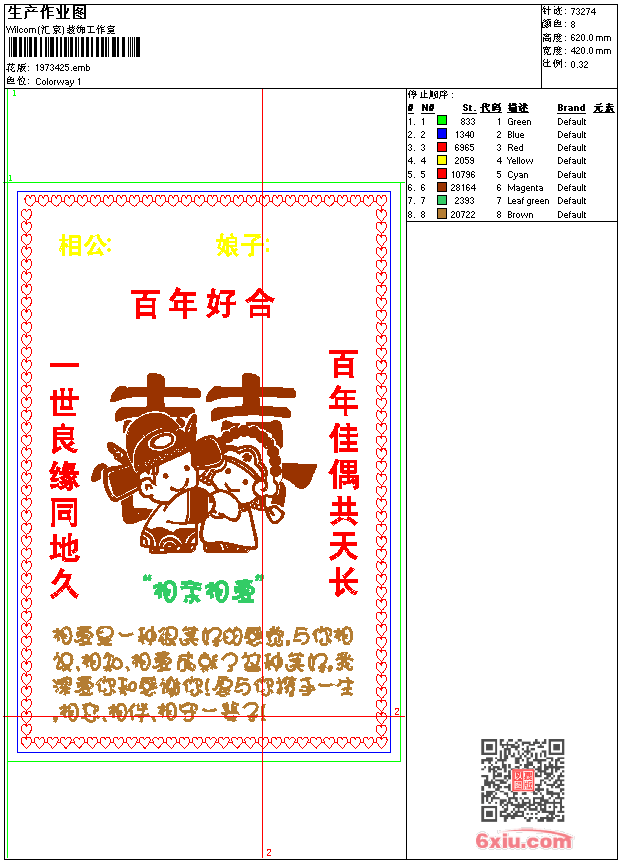 喜 囍 双喜 喜庆 结婚礼 中国风 天长地久 百年好合 字画 精品 点此上传花版兑乐绣币/现金 emb花版参数: 大小:214.00 KB / 尺寸:420*620[毫米] / 针数:73274针 / 线色:8 / 格式:emb / 版本:9 版带文件需绣花软件方可打开,可配色打印导出各种格式或直接上机绣。如无绣花软件可下载1:1模拟效果图。 PNG图片信息:大小:1.6 (MB) /图宽*高:1589x2346(像素) 上传作者( 1598*** ) 获得乐绣币:20个 emb下载 1:1图下载 关闭 相似花型推荐: 虎 猛虎下山 精品 字画 康有为 人与天通 凤凰 松树 黄山迎客松 工艺精品墙挂壁画 树 椰树 east cartel 骷髅 英文鬼头 revive 狗 章 卡通 童 章仔 男 paw patrol 虎 上山猛虎 精品 人物 钟馗 神话 精品 神仙 中国传统门神 佛绣字 菩提本无树 明镜亦非台 佛性常清净 章标 英雄联盟 logo 狐狸 九尾狐 狐狸 龙 九尾狐 果实 金桔 水果 精品 上一个花样:章仔 汽车 下一个花样:虎 猛虎下山 精品
