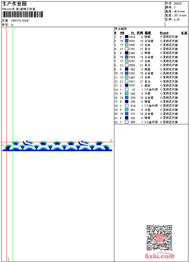 条码 海水纹海浪 点此上传花版兑乐绣币/现金 emb花版参数: 大小:107.50 KB / 尺寸:351*46[毫米] / 针数:26625针 / 线色:7 / 格式:emb / 版本:9 版带文件需绣花软件方可打开,可配色打印导出各种格式或直接上机绣。如无绣花软件可下载1:1模拟效果图。 PNG图片信息:大小:0.4 (MB) /图宽*高:1328x174(像素) 上传作者( 张金*** ) 获得乐绣币:1个 emb下载 1:1图下载 关闭 相似花型推荐: 麒麟终曲版 中国风龙 墙布 背景墙 旭日东升 风景 山水 鸟鹤 章标 穿梭机 珠片 熊 乱针绣 美女 贴布 抽象 时装 恐龙头 恐龙 鹿 卡通 童装 人物 男生 童子军 人物 蜡笔小星 猫 毛巾绣肥猫 卡通 男 海贼王 鸡 工艺公鸡 精品 花边条幅 时装左下脚 上一个花样:荷花 下一个花样:麒麟终曲版 中国风龙
