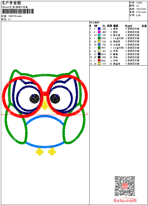 猫头鹰贴布 点此上传花版兑乐绣币/现金 emb花版参数: 大小:136.00 KB / 尺寸:219*137[毫米] / 针数:11063针 / 线色:10 / 格式:emb / 版本:9 版带文件需绣花软件方可打开,可配色打印导出各种格式或直接上机绣。如无绣花软件可下载1:1模拟效果图。 PNG图片信息:大小:0.2 (MB) /图宽*高:830x517(像素) 上传作者( fang*** ) 获得乐绣币:5个 emb下载 1:1图下载 关闭 相似花型推荐: 花鸟牡丹 精品女装 鱼 中国风 吉祥 鲤鱼 荷花 条码 海水纹海浪 麒麟终曲版 中国风龙 墙布 背景墙 旭日东升 风景 山水 鸟鹤 章标 穿梭机 珠片 熊 乱针绣 美女 贴布 抽象 时装 恐龙头 恐龙 鹿 卡通 童装 人物 男生 童子军 人物 蜡笔小星 猫 毛巾绣肥猫 上一个花样:蝴蝶花 抽象 下一个花样:花鸟牡丹 精品女装