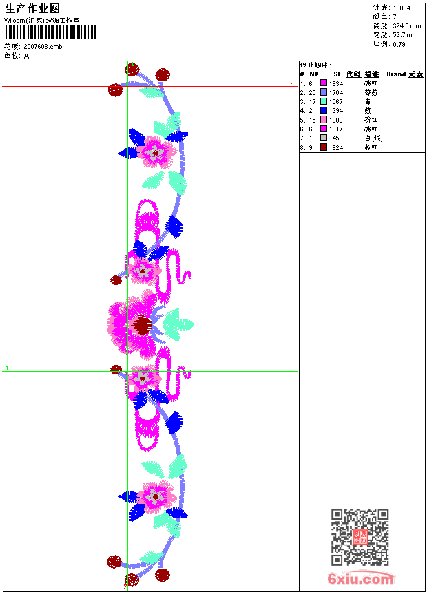 - emb花版参数: 大小:88.50 KB / 尺寸:54*324[毫米] / 针数:10084针 / 线色:7 / 格式:emb / 版本:e2