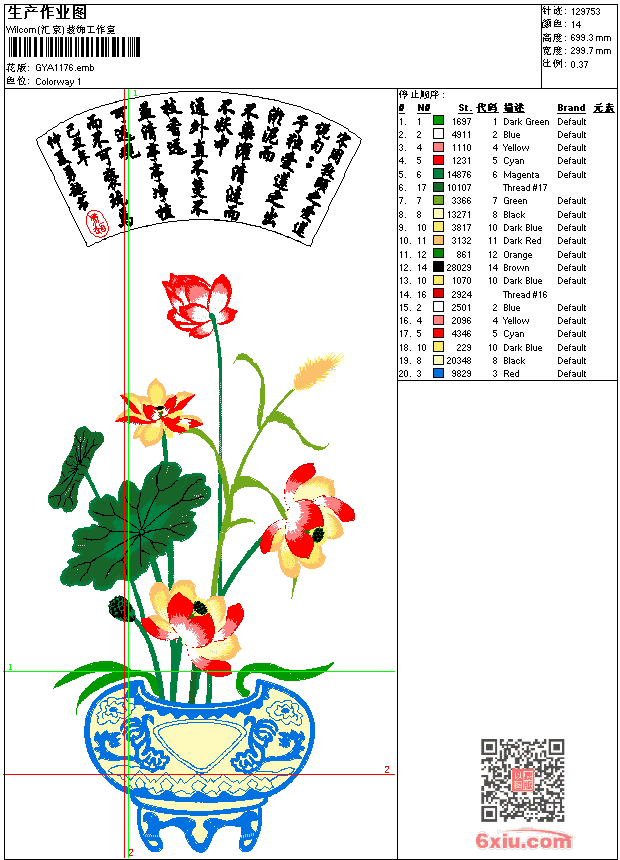 荷花 爱莲说 工艺精品 点此上传花版兑乐绣币/现金 emb花版参数: 大小:586.50 KB / 尺寸:300*699[毫米] / 针数:129753针 / 线色:14 / 格式:emb / 版本:9 版带文件需绣花软件方可打开,可配色打印导出各种格式或直接上机绣。如无绣花软件可下载1:1模拟效果图。 PNG图片信息:大小:1.9 (MB) /图宽*高:1134x2646(像素) 上传作者( keen*** ) 获得乐绣币:130个 emb下载 1:1图下载 关闭 相似花型推荐: 鸟 工艺精品 水果 石榴 工艺精品 风景 松壑飞瀑图 工艺精品 云山雾海 台布 牛 牧童放牛图 工艺精品 牡丹花 长尾鸟 富贵吉祥长寿 工艺精品 牡丹花 鸟 富贵吉祥长寿图 工艺精品 牡丹花 花开富贵 工艺精品 牡丹花 竹 满园春光 工艺精品 桌布 鸟 中堂画春夏秋冬 夏 工艺精品 鲤鱼 工艺精品 鹰 男装 靓花 一只香 工艺精品 简单花 上一个花样:字画 草书作品 工艺精品 下一个花样:鸟 工艺精品