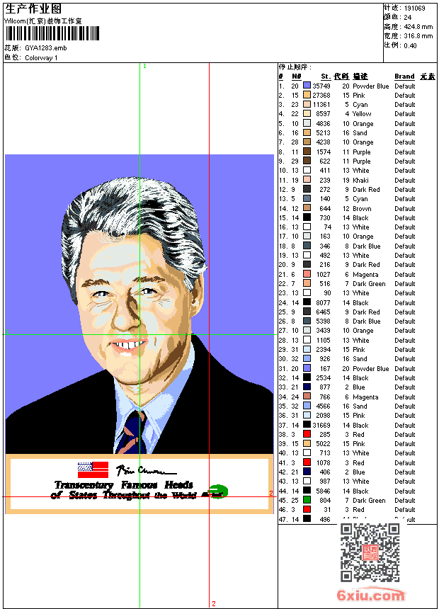 人像绣 照片绣 克林顿斯基 帅哥 工艺精品 点此上传花版兑乐绣币/现金 emb花版参数: 大小:6.90 MB / 尺寸:317*425[毫米] / 针数:191069针 / 线色:24 / 格式:emb / 版本:2006 版带文件需绣花软件方可打开,可配色打印导出各种格式或直接上机绣。如无绣花软件可下载1:1模拟效果图。 PNG图片信息:大小:3.1 (MB) /图宽*高:1199x1607(像素) 上传作者( keen*** ) 获得乐绣币:191个 emb下载 1:1图下载 关闭 相似花型推荐: 虎 十字绣老虎 工艺精品 男装 狮子 狮头 工艺精品 鹤 群鹤图 工艺精品 鹤 波浪 清朝官服 工艺精品 人物 宗教 工艺精品 人物 宗教 工艺精品 麒麟 工艺精品 字画 难得糊涂 工艺精品 乱针绣 美女 工艺精品 乱针绣 美女 工艺精品 人物 毛主席 工艺精品 字画 毛泽东书法 工艺精品 字画 毛泽东诗词书法 工艺精品 猫头鹰 珠片 上一个花样:鹤 双鹤 工艺精品 下一个花样:虎 十字绣老虎 工艺精品