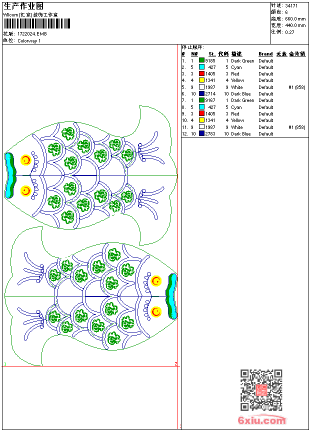 鱼吉祥中国结珠片 点此上传花版兑乐绣币/现金 emb花版参数: 大小:159.50 KB / 尺寸:440*660[毫米] / 针数:34171针 / 线色:6 / 格式:emb / 版本:2006 版带文件需绣花软件方可打开,可配色打印导出各种格式或直接上机绣。如无绣花软件可下载1:1模拟效果图。 PNG图片信息:大小:1.6 (MB) /图宽*高:1665x2497(像素) 上传作者( huan*** ) 获得乐绣币:10个 emb下载 1:1图下载 关闭 相似花型推荐: 毛巾绣卡通人物 毛巾绣卡通-大白-超能陆战队 凤凰吉祥喜庆飞舞工艺精品 风景黄山云烟-乱针绣工艺精品 黄鹤楼风景工艺精品 孔雀花开富贵工艺精品 鸟 皇冠 汽车 羊卡通 保龄球 国旗章 鹿章标 鬼脸 鸟-鹦鹉章 上一个花样:鱼吉祥中国结珠片-相亲相爱 下一个花样:毛巾绣卡通人物