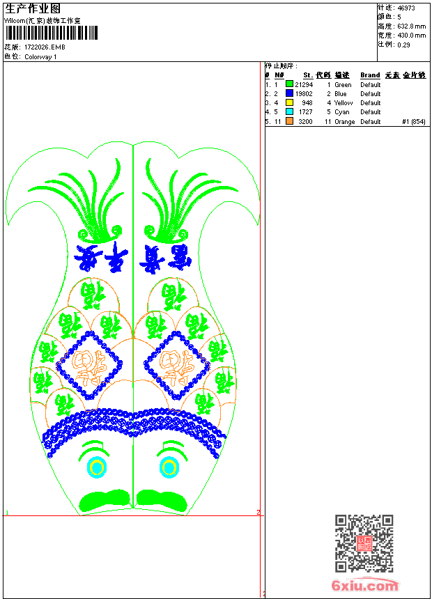 鱼吉祥中国结珠片-富贵平安 点此上传花版兑乐绣币/现金 emb花版参数: 大小:281.50 KB / 尺寸:430*633[毫米] / 针数:46973针 / 线色:5 / 格式:emb / 版本:2006 版带文件需绣花软件方可打开,可配色打印导出各种格式或直接上机绣。如无绣花软件可下载1:1模拟效果图。 PNG图片信息:大小:1.7 (MB) /图宽*高:1627x2394(像素) 上传作者( huan*** ) 获得乐绣币:10个 emb下载 1:1图下载 关闭 相似花型推荐: 鱼吉祥中国结珠片-相亲相爱 鱼吉祥中国结珠片 毛巾绣卡通人物 毛巾绣卡通-大白-超能陆战队 凤凰吉祥喜庆飞舞工艺精品 风景黄山云烟-乱针绣工艺精品 黄鹤楼风景工艺精品 孔雀花开富贵工艺精品 鸟 皇冠 汽车 羊卡通 保龄球 国旗章 鹿章标 上一个花样:鱼吉祥中国结珠片-年年有余 下一个花样:鱼吉祥中国结珠片-相亲相爱
