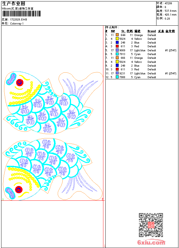 鱼吉祥中国结珠片-鱼跃龙门 点此上传花版兑乐绣币/现金 emb花版参数: 大小:337.50 KB / 尺寸:420*538[毫米] / 针数:47352针 / 线色:6 / 格式:emb / 版本:7 版带文件需绣花软件方可打开,可配色打印导出各种格式或直接上机绣。如无绣花软件可下载1:1模拟效果图。 PNG图片信息:大小:1.7 (MB) /图宽*高:1589x2035(像素) 上传作者( huan*** ) 获得乐绣币:10个 emb下载 1:1图下载 关闭 相似花型推荐: 鱼吉祥中国结珠片-年年有余 鱼吉祥中国结珠片-富贵平安 鱼吉祥中国结珠片-相亲相爱 鱼吉祥中国结珠片 毛巾绣卡通人物 毛巾绣卡通-大白-超能陆战队 凤凰吉祥喜庆飞舞工艺精品 风景黄山云烟-乱针绣工艺精品 黄鹤楼风景工艺精品 孔雀花开富贵工艺精品 鸟 皇冠 汽车 羊卡通 保龄球 上一个花样:龙骷髅头 下一个花样:鱼吉祥中国结珠片-年年有余