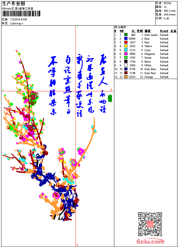 梅花书法字-精品工艺 品 点此上传花版兑乐绣币/现金 emb花版参数: 大小:354.00 KB / 尺寸:284*443[毫米] / 针数:55754针 / 线色:12 / 格式:emb / 版本:2006 版带文件需绣花软件方可打开,可配色打印导出各种格式或直接上机绣。如无绣花软件可下载1:1模拟效果图。 PNG图片信息:大小:1.0 (MB) /图宽*高:1076x1677(像素) 上传作者( huan*** ) 获得乐绣币:10个 emb下载 1:1图下载 关闭 相似花型推荐: 荷花蜻蜓-精品工艺品 anta-logo 鸟上梅花枝头-精品工艺品 鸟上兰花枝头-精品工艺品 龙骷髅头 鱼吉祥中国结珠片-鱼跃龙门 鱼吉祥中国结珠片-年年有余 鱼吉祥中国结珠片-富贵平安 鱼吉祥中国结珠片-相亲相爱 鱼吉祥中国结珠片 毛巾绣卡通人物 毛巾绣卡通-大白-超能陆战队 凤凰吉祥喜庆飞舞工艺精品 风景黄山云烟-乱针绣工艺精品 黄鹤楼风景工艺精品 上一个花样:鸟上竹枝头-精品唐装 下一个花样:荷花蜻蜓-精品工艺品