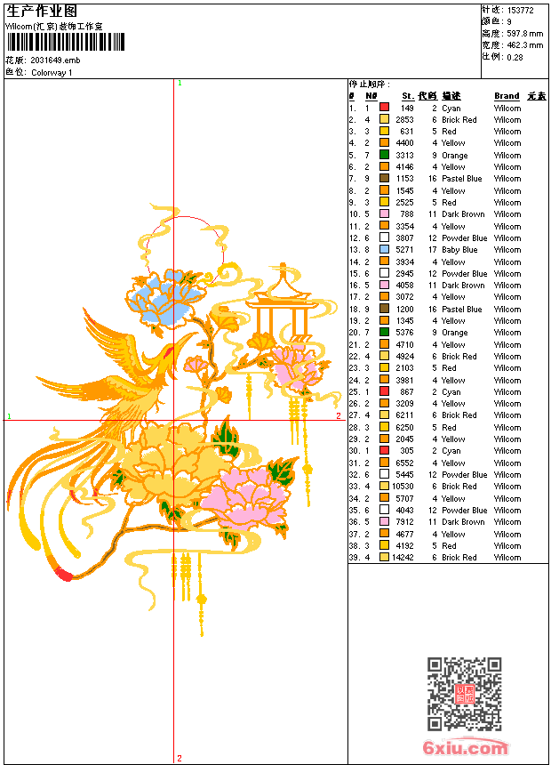 凤凰 汉服 点此上传花版兑乐绣币/现金 emb花版参数: 大小:1.52 MB / 尺寸:462*598[毫米] / 针数:153772针 / 线色:9 / 格式:emb / 版本:9 版带文件需绣花软件方可打开,可配色打印导出各种格式或直接上机绣。如无绣花软件可下载1:1模拟效果图。 PNG图片信息:大小:0.4 (MB) /图宽*高:1749x2262(像素) 上传作者( ZJQ8*** ) 获得乐绣币:150个 emb下载 1:1图下载 关闭 相似花型推荐: 蝴蝶花 汉服 莲花鱼 汉服 神兽 乘黄 汉服 狐狸 鹿 银鹿 汉服 金凤凰 汉服 汉服 彼岸花 头纱 汉服 彼岸花 火苗彼岸花 汉服 吞肩兽 汉服 牛头纹大 汉服 牛头纹 汉服 金刚经 龙 令旗单面 令旗 方块璎珞 汉服 上一个花样:小凤凰 汉服 下一个花样:蝴蝶花 汉服