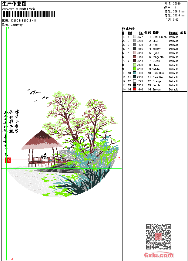 草亭 圆扇 点此上传花版兑乐绣币/现金 emb花版参数: 大小:297.50 KB / 尺寸:332*306[毫米] / 针数:35080针 / 线色:14 / 格式:emb / 版本:e2 版带文件需绣花软件方可打开,可配色打印导出各种格式或直接上机绣。如无绣花软件可下载1:1模拟效果图。 PNG图片信息:大小:1.3 (MB) /图宽*高:1258x1159(像素) 上传作者( *** ) 获得乐绣币:个 emb下载 1:1图下载 关闭 相似花型推荐: 民族风圆形 靓花 蝴蝶 竹子 蜻蜓 靓花 三只老鼠 梅花 凤凰 牡丹花 牡丹花 鸟 靓花 龙 靓花 蝴蝶 龙 蝴蝶 靓花 荷花 乱针绣 上一个花样:梅花 下一个花样:民族风圆形