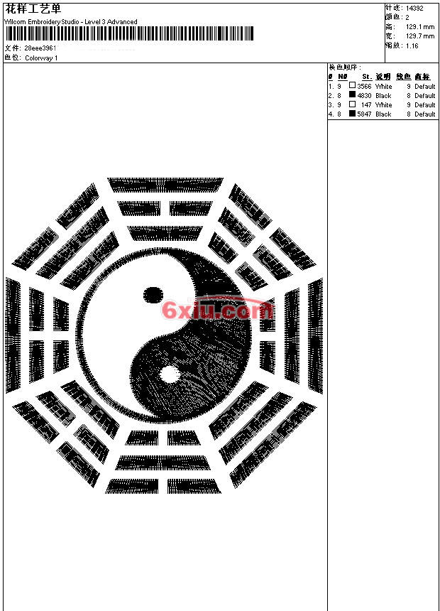 太极八卦 点此上传花版兑乐绣币/现金 emb花版参数: 大小:66.50 KB / 尺寸:130*129[毫米] / 针数:14394针 / 线色:2 / 格式:emb / 版本:e2 版带文件需绣花软件方可打开,可配色打印导出各种格式或直接上机绣。如无绣花软件可下载1:1模拟效果图。 PNG图片信息:大小:0.3 (MB) /图宽*高:491x489(像素) 上传作者( 子夜*** ) 获得乐绣币:15个 emb下载 1:1图下载 关闭 相似花型推荐: 猫 西部牛仔猫 汉服 梅花 鸟 靓花 裙 汉服披肩 圆形 汉服大袖 鸟 汉服 鸟 墙布 荷花 背景墙 精品 荷花鱼 墙布 玄关 墙布 鱼 孔雀鱼 双鱼 玄关 墙布 荷花 九鱼呈祥 精品 墙布 福禄有余 五福鱼 玄关 葫芦 墙布 羽毛 玄关 靓花 少数民族背带花 鸟 象 大象 动物 猫 动物 上一个花样:墙布 山水情 背景墙 下一个花样:猫 西部牛仔猫