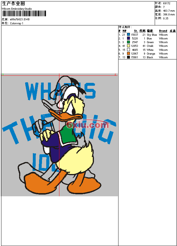 唐老鸭 点此上传花版兑乐绣币/现金 emb花版参数: 大小:167.00 KB / 尺寸:387*404[毫米] / 针数:69165针 / 线色:7 / 格式:emb / 版本:e2 版带文件需绣花软件方可打开,可配色打印导出各种格式或直接上机绣。如无绣花软件可下载1:1模拟效果图。 PNG图片信息:大小:2.2 (MB) /图宽*高:1464x1527(像素) 上传作者( ya95*** ) 获得乐绣币:10个 emb下载 1:1图下载 关闭 相似花型推荐: 靓 花朵 熊 虎头 熊 车标志 北京现代 鳄鱼 猫头 狗头 少数民族花边 只算三分一针数 十字绣 少数民族花边 只算三分一半针数 十字绣 少数民族服饰 十字绣 只算4分一针数 龙头 渐变毛巾绣 中空绣蝴蝶 龙 立体花朵 上一个花样:牙刷绣 B 下一个花样:靓 花朵