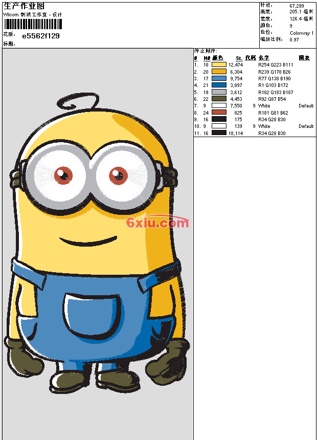 卡通 小黄人 (只算部分针数) 点此上传花版兑乐绣币/现金 emb花版参数: 大小:561.50 KB / 尺寸:126*205[毫米] / 针数:67299针 / 线色:9 / 格式:emb / 版本:e4.2 版带文件需绣花软件方可打开,可配色打印导出各种格式或直接上机绣。如无绣花软件可下载1:1模拟效果图。 PNG图片信息:大小:0.7 (MB) /图宽*高:479x776(像素) 上传作者( wuwu*** ) 获得乐绣币:30个 emb下载 1:1图下载 关闭 相似花型推荐: 香蕉 (只算部分针数) 兰草 花 鸟 喜鹊 鸟 喜上枝头 头像 印第安人 鸟 两只小鸟 戏曲服装 1尺2凤衣 凤凰 戏曲服装 道袍 1尺2八卦衣 太极 戏曲服装 龙 1尺1五色令旗订 欧式花型 兔子 汉服 莲花纹 民族风 荷花 熊猫国宝 上一个花样:风火轮 西游记 哪吒 下一个花样:香蕉 (只算部分针数)