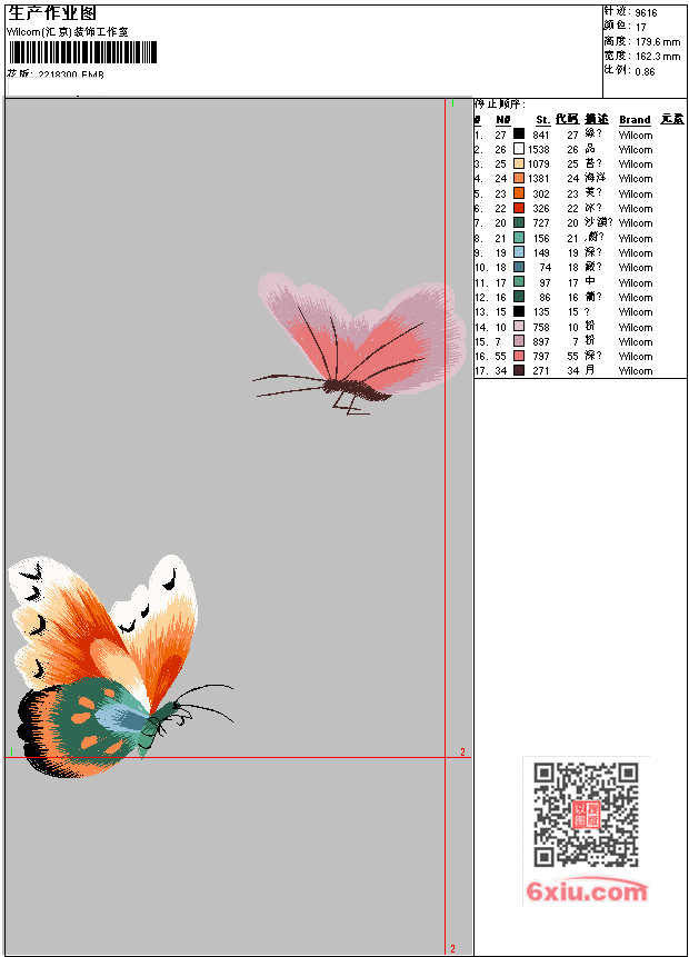 蝴蝶 点此上传花版兑乐绣币/现金 EMB花版参数: 大小:112.50 KB / 尺寸:162*180[毫米] / 针数:9616针 / 线色:17 / 格式:EMB / 版本:e4.2 版带文件需绣花软件方可打开,可配色打印导出各种格式或直接上机绣。如无绣花软件可下载1:1模拟效果图。 PNG图片信息:大小:0.2(MB) /图宽*高:614x680(像素) 上传作者( xxh8*** ) 获得乐绣币:10个 EMB下载 1:1图下载 关闭 相似花型推荐: 蝴蝶 蝴蝶 熊猫 蝶恋花 靓花 玫瑰花 靓花 现代线条 鱼 漓江山水 背景墙 中式山水背景墙 山水 猫 牡丹花 猫头 边牧头像 狗 小猫咪 靓花 蝴蝶 腰带 靓花 上一个花样:凤凰 下一个花样:蝴蝶