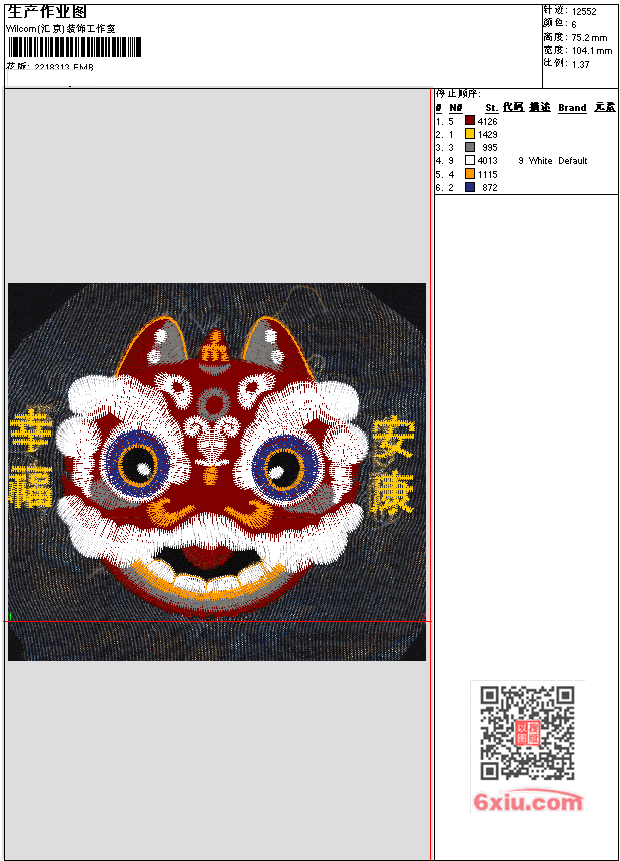 醒狮头 点此上传花版兑乐绣币/现金 EMB花版参数: 大小:2.45 MB / 尺寸:104*75[毫米] / 针数:12552针 / 线色:6 / 格式:EMB / 版本:e4.2 版带文件需绣花软件方可打开,可配色打印导出各种格式或直接上机绣。如无绣花软件可下载1:1模拟效果图。 PNG图片信息:大小:0.2(MB) /图宽*高:394x285(像素) 上传作者( magi*** ) 获得乐绣币:10个 EMB下载 1:1图下载 关闭 相似花型推荐: 龙 兰花 兰花 凤凰 蝴蝶 蝴蝶 蝴蝶 熊猫 蝶恋花 靓花 玫瑰花 靓花 现代线条 鱼 漓江山水 背景墙 中式山水背景墙 山水 猫 牡丹花 上一个花样:靓花 下一个花样:龙