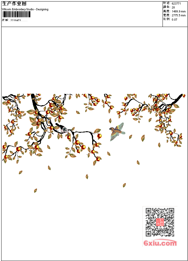 柿柿如意背景墙布 点此上传花版兑乐绣币/现金 EMB花版参数: 大小:11.81 MB / 尺寸:2776*1500[毫米] / 针数:624750针 / 线色:28 / 格式:EMB / 版本:e4.2 版带文件需绣花软件方可打开,可配色打印导出各种格式或直接上机绣。如无绣花软件可下载1:1模拟效果图。 PNG图片信息:大小:25.7(MB) /图宽*高:10490x5669(像素) 上传作者( 平凡*** ) 获得乐绣币:600个 EMB下载 1:1图下载 关闭 相似花型推荐: 青山绿水背景墙布 花开富贵孔雀背景墙布 玉兰花鸟背景墙布 腊梅鸟背景墙布 线条猫 跑车 熊 豹头 熊猫竹 牡丹花 水仙花 玉兰花 绣球花 蛇宝宝 小鸟 插针 上一个花样:欧式墙布 下一个花样:青山绿水背景墙布