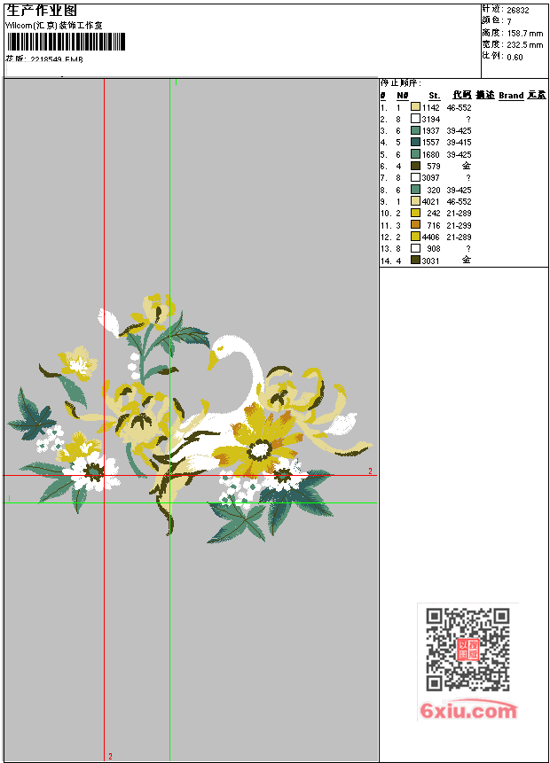 菊花 点此上传花版兑乐绣币/现金 EMB花版参数: 大小:231.00 KB / 尺寸:232*159[毫米] / 针数:26832针 / 线色:7 / 格式:EMB / 版本:e4.2 版带文件需绣花软件方可打开,可配色打印导出各种格式或直接上机绣。如无绣花软件可下载1:1模拟效果图。 PNG图片信息:大小:0.5(MB) /图宽*高:880x601(像素) 上传作者( magi*** ) 获得乐绣币:20个 EMB下载 1:1图下载 关闭 相似花型推荐: 竹 鸟语花香 墙布 老虎头 花蓝 尾巴花 龙 蛇 大侠2 大侠 鸟 牡丹花 龙圆型 飞天小魔女 凤凰抱枕5珠2珠片 DHP 兔兔单针勾勒 DHP 上一个花样:竹芭蕉 下一个花样:竹