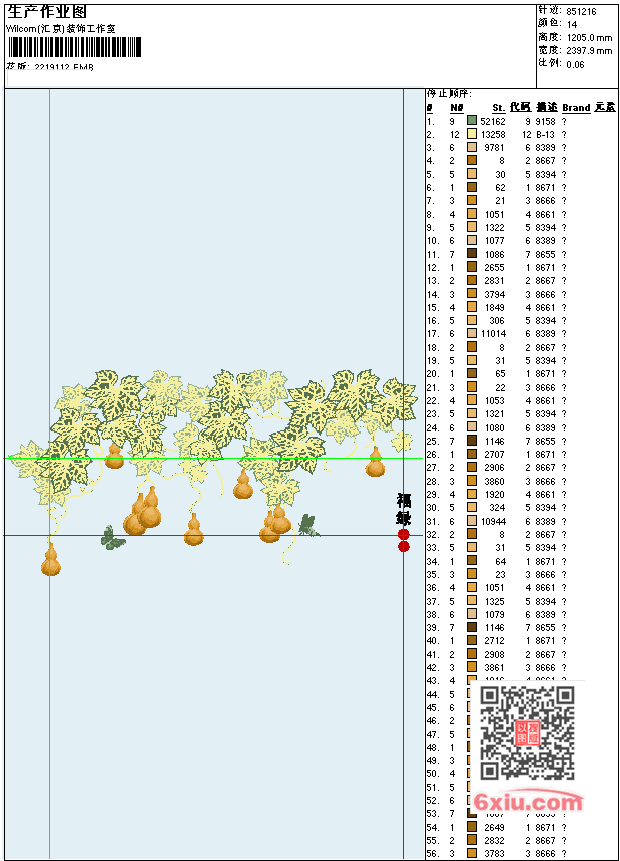 福禄墙布 葫芦 背景墙 上传花版得乐绣币/现金 EMB花版参数: 大小:5.05 MB / 尺寸:2398*1205[毫米] / 针数:851216针 / 线色:14 / 格式:EMB / 版本:e4.2 版带文件需绣花软件方可打开,可配色打印导出各种格式或直接上机绣。如无绣花软件可下载1:1模拟效果图。 模拟图片信息:大小:6.5(MB) /图宽*高:9062x4554(像素) 上传作者( 平*** ) 获得乐绣币:850个 EMB下载 1:1图下载 收藏本图 关闭 相似花型推荐: 阁楼墙布 背景墙 千里江山墙布 背景墙 现代墙布 梅花鹿 背景墙 新款凤舞九天 孔雀 背景墙 现代城市 背景墙 腾龙 背景墙 猫乱针绣 龙 梅花 鸟 狐狸 汉服 花卉 蝴蝶 桃子 毛巾绣老虎头 升龙 松枝 松枝 上一个花样:亭台阁楼墙布-uncheck 下一个花样:阁楼墙布 背景墙