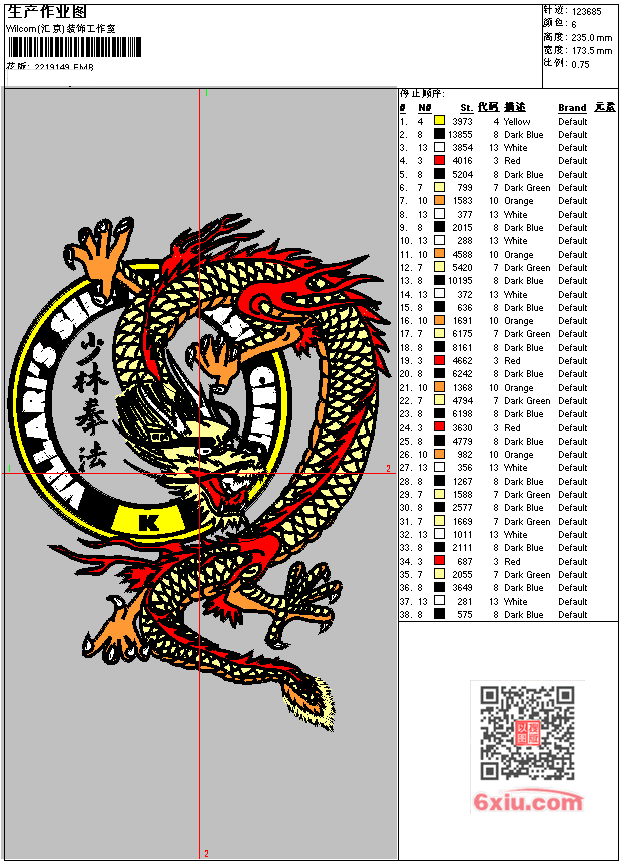 龙 少林拳法 上传花版得乐绣币/现金 EMB花版参数: 大小:830.00 KB / 尺寸:173*235[毫米] / 针数:123685针 / 线色:6 / 格式:EMB / 版本:e4.2 版带文件需绣花软件方可打开,可配色打印导出各种格式或直接上机绣。如无绣花软件可下载1:1模拟效果图。 模拟图片信息:大小:0.2(MB) /图宽*高:657x889(像素) 上传作者( 2791*** ) 获得乐绣币:100个 EMB下载 1:1图下载 收藏本图 关闭 相似花型推荐: 公鸡带小鸡 公鸡 珠片 锦绣江山 精品 老虎 猛虎下山 一声虎啸镇百兽 精品 牡丹花 靓花 玫瑰花 马 福禄墙布 葫芦 背景墙 阁楼墙布 背景墙 千里江山墙布 背景墙 现代城市 背景墙 腾龙 背景墙 猫乱针绣 龙 梅花 鸟 上一个花样:龙-uncheck 下一个花样:公鸡带小鸡