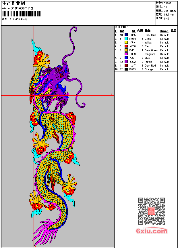 龙 上传花版得乐绣币/现金 EMB花版参数: 大小:511.00 KB / 尺寸:100*385[毫米] / 针数:71868针 / 线色:10 / 格式:EMB / 版本:e4.2 版带文件需绣花软件方可打开,可配色打印导出各种格式或直接上机绣。如无绣花软件可下载1:1模拟效果图。 模拟图片信息:大小:0.2(MB) /图宽*高:378x1458(像素) 上传作者( 2791*** ) 获得乐绣币:70个 EMB下载 1:1图下载 收藏本图 关闭 相似花型推荐: 龙 龙 龙 少林拳法 公鸡带小鸡 公鸡 珠片 锦绣江山 精品 老虎 猛虎下山 一声虎啸镇百兽 精品 牡丹花 靓花 玫瑰花 马 福禄墙布 葫芦 背景墙 阁楼墙布 背景墙 千里江山墙布 背景墙 现代城市 背景墙 腾龙 背景墙 上一个花样:蝴蝶-uncheck 下一个花样:龙