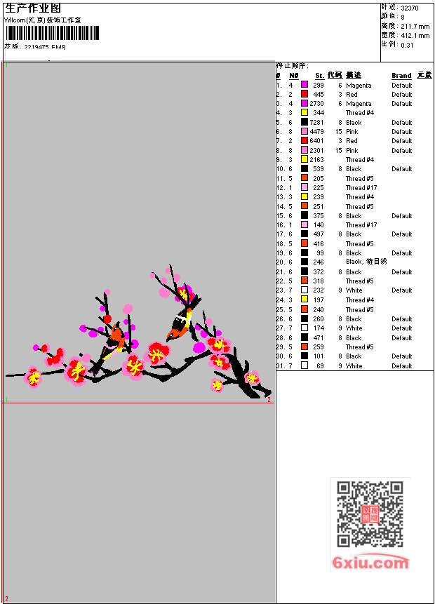 - EMB花版参数: 大小:243.00 KB / 尺寸:412*212[毫米] / 针数:32370针 / 线色:8 / 格式:EMB / 版本:e4.2