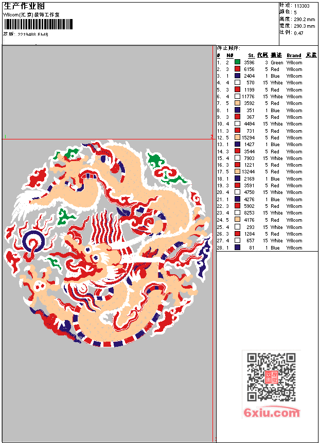 - EMB花版参数: 大小:642.00 KB / 尺寸:290*290[毫米] / 针数:113303针 / 线色:5 / 格式:EMB / 版本:e4.2