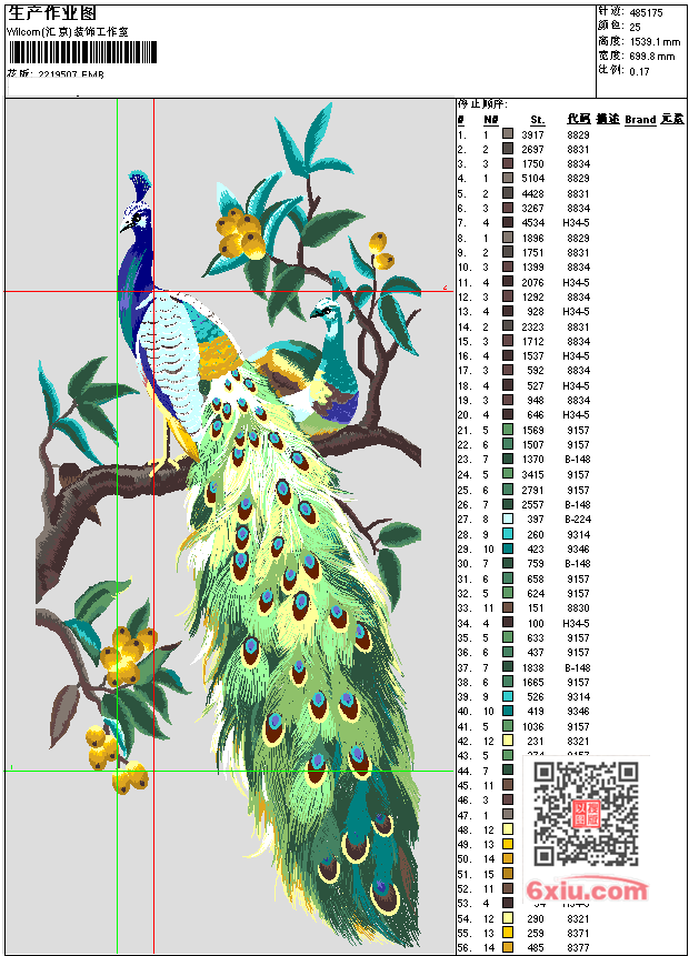 - EMB花版参数: 大小:2.46 MB / 尺寸:700*1539[毫米] / 针数:485175针 / 线色:25 / 格式:EMB / 版本:e4.2
