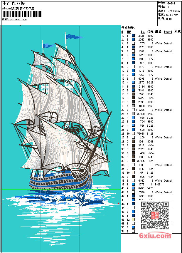- EMB花版参数: 大小:1.14 MB / 尺寸:695*1274[毫米] / 针数:380981针 / 线色:12 / 格式:EMB / 版本:e4.2