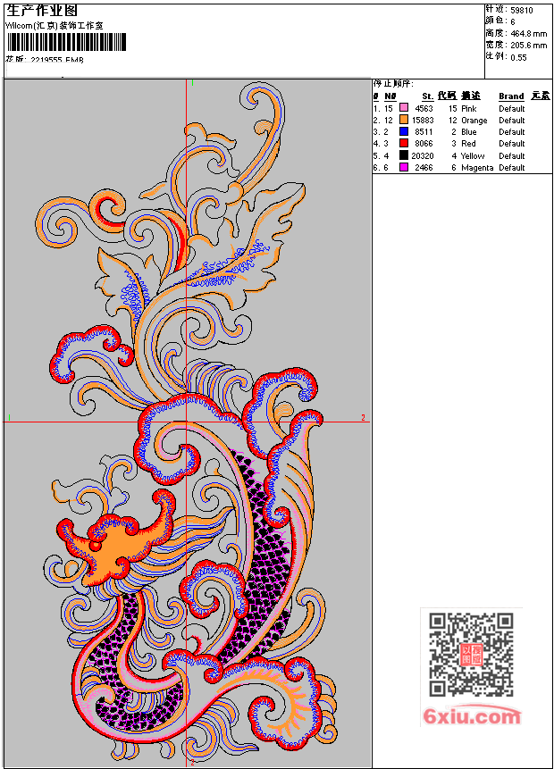 - EMB花版参数: 大小:346.00 KB / 尺寸:206*465[毫米] / 针数:59810针 / 线色:6 / 格式:EMB / 版本:e4.2
