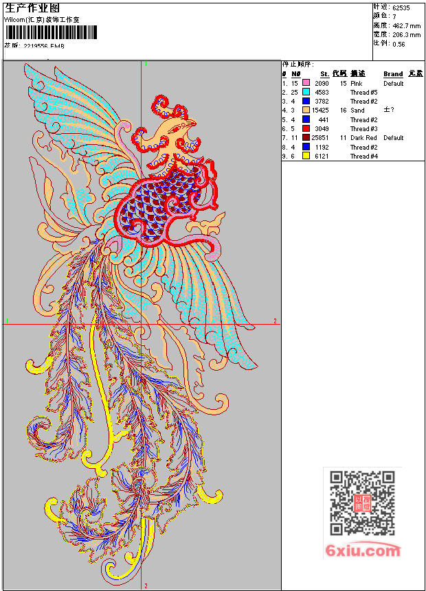 - EMB花版参数: 大小:448.50 KB / 尺寸:206*463[毫米] / 针数:62535针 / 线色:7 / 格式:EMB / 版本:e4.2