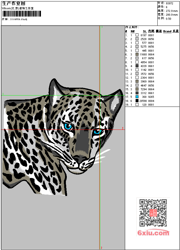 - EMB花版参数: 大小:444.00 KB / 尺寸:281*273[毫米] / 针数:93972针 / 线色:6 / 格式:EMB / 版本:e4.2