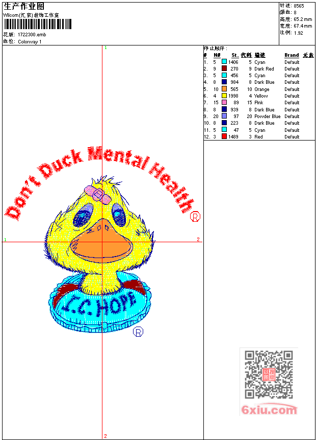 小鸭子 点此上传花版兑乐绣币/现金 emb花版参数: 大小:72.00 KB / 尺寸:67*65[毫米] / 针数:8565针 / 线色:8 / 格式:emb / 版本:6 版带文件需绣花软件方可打开,可配色打印导出各种格式或直接上机绣。如无绣花软件可下载1:1模拟效果图。 PNG图片信息:大小:0.1 (MB) /图宽*高:255x247(像素) 上传作者( wy19*** ) 获得乐绣币:10个 emb下载 1:1图下载 关闭 相似花型推荐: 溜冰标 吊车 狼头 熊头 美女 轮船 星球大战garolina 苹果 鱼排骨 人物 豹头标 山羊 鹰章 人物小孩 鸟标 上一个花样:龟 下一个花样:溜冰标