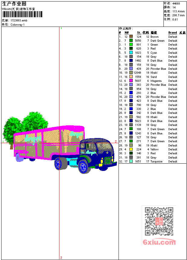货车 点此上传花版兑乐绣币/现金 emb花版参数: 大小:181.00 KB / 尺寸:209*113[毫米] / 针数:44668针 / 线色:14 / 格式:emb / 版本:6 版带文件需绣花软件方可打开,可配色打印导出各种格式或直接上机绣。如无绣花软件可下载1:1模拟效果图。 PNG图片信息:大小:0.5 (MB) /图宽*高:790x430(像素) 上传作者( wy19*** ) 获得乐绣币:10个 emb下载 1:1图下载 关闭 相似花型推荐: 花仙女 人物标 棒球标 鹰标 武士 向日葵 蛇 椰树月亮 校车 线条花 蜜蜂 鱼标 锦绣前程之富贵大顺工艺精品牡丹花鸟 金猪送福工艺精品毛巾绣 鸟金秋硕果满枝头工艺精品 上一个花样:心形章 下一个花样:花仙女