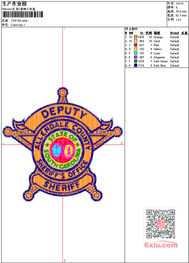 章仔 点此上传花版兑乐绣币/现金 emb花版参数: 大小:87.50 KB / 尺寸:83*79[毫米] / 针数:16310针 / 线色:8 / 格式:emb / 版本:6 版带文件需绣花软件方可打开,可配色打印导出各种格式或直接上机绣。如无绣花软件可下载1:1模拟效果图。 PNG图片信息:大小:0.1 (MB) /图宽*高:313x298(像素) 上传作者( wy19*** ) 获得乐绣币:10个 emb下载 1:1图下载 关闭 相似花型推荐: 赛旗racing 鹰头 六星章 骑马武士 豹头 国旗 棒球章 龙 龙 京剧脸谱 米老鼠5mm珠片 pp线梅花 时装复杂绣花 抽像曲线时装绣花 盾牌剑 上一个花样:五角星 下一个花样:赛旗racing