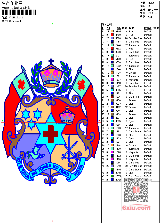 章标皇冠 点此上传花版兑乐绣币/现金 emb花版参数: 大小:421.50 KB / 尺寸:196*254[毫米] / 针数:117542针 / 线色:12 / 格式:emb / 版本:6 版带文件需绣花软件方可打开,可配色打印导出各种格式或直接上机绣。如无绣花软件可下载1:1模拟效果图。 PNG图片信息:大小:1.1 (MB) /图宽*高:740x962(像素) 上传作者( wy19*** ) 获得乐绣币:10个 emb下载 1:1图下载 关闭 相似花型推荐: 丹顶鹤-旗袍牡丹大花精品 梅花牡丹花旗袍参花-中国风 旗袍花朵 梅花-鸟-旗袍-腊梅-中国风 锦绣前呈-旗袍-花朵 衣领珠片 乡村姑娘美女 狮标章仔 裤袋曲线 老虎-精品工艺品 水溶花-满幅 鲤鱼精品 莲花工艺精品-佛 鹤工艺精品-岁月如歌 荷花-莲花-工艺精品 上一个花样:熊标 下一个花样:丹顶鹤-旗袍牡丹大花精品