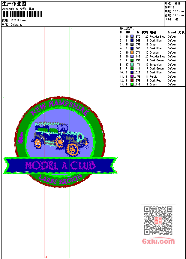 老爷车 点此上传花版兑乐绣币/现金 emb花版参数: 大小:91.50 KB / 尺寸:91*72[毫米] / 针数:19936针 / 线色:9 / 格式:emb / 版本:6 版带文件需绣花软件方可打开,可配色打印导出各种格式或直接上机绣。如无绣花软件可下载1:1模拟效果图。 PNG图片信息:大小:0.1 (MB) /图宽*高:346x274(像素) 上传作者( wy19*** ) 获得乐绣币:10个 emb下载 1:1图下载 关闭 相似花型推荐: 脚掌 男polo章 人物 鬼-ghost-笑脸 印第安人 绣花枕头一肚草-花条-装饰 绣花枕头一肚草-花条-装饰 绣花枕头一肚草-花条-装饰 鸳鸯荷花-精品 十字绣玫瑰花-衣服上身-民族 十字绣玫瑰花-衣服上身 牡丹花-百花争艳 十字绣条带-民族衣服上身 鸟儿 链条4色-特种绣 上一个花样:酒杯 下一个花样:脚掌
