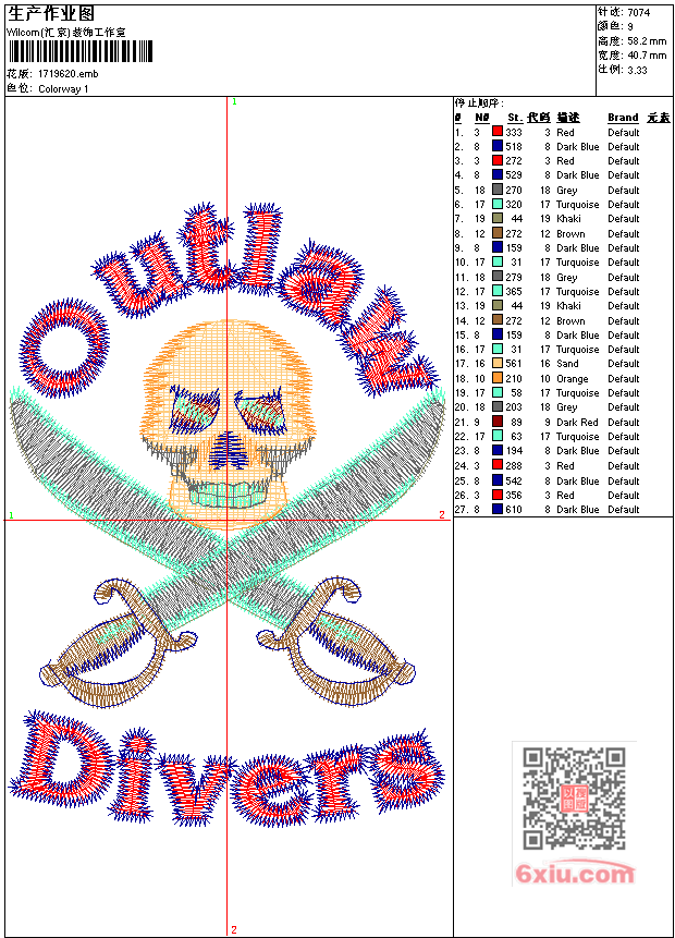 骷髅 点此上传花版兑乐绣币/现金 emb花版参数: 大小:86.50 KB / 尺寸:41*58[毫米] / 针数:7074针 / 线色:9 / 格式:emb / 版本:6 版带文件需绣花软件方可打开,可配色打印导出各种格式或直接上机绣。如无绣花软件可下载1:1模拟效果图。 PNG图片信息:大小:0.1 (MB) /图宽*高:155x221(像素) 上传作者( cylc*** ) 获得乐绣币:10个 emb下载 1:1图下载 关闭 相似花型推荐: 机器人 齐天大圣-猴子 十字绣玫瑰花 豹子头 领民族古典 领-盘带 牡丹花传统 手-佛 龙 凤凰鸟 龙 比利保罗骑士polo 小马 猫眼-玩具靠垫 鬼头骷髅 上一个花样:北极熊 下一个花样:机器人