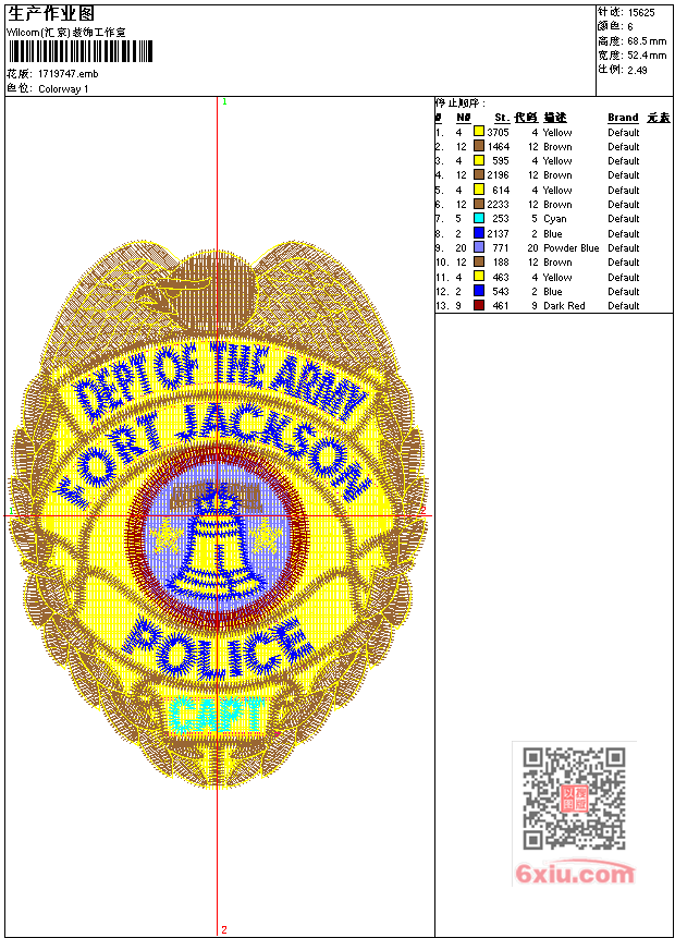 警察徽章 点此上传花版兑乐绣币/现金 emb花版参数: 大小:101.00 KB / 尺寸:52*68[毫米] / 针数:15624针 / 线色:6 / 格式:emb / 版本:6 版带文件需绣花软件方可打开,可配色打印导出各种格式或直接上机绣。如无绣花软件可下载1:1模拟效果图。 PNG图片信息:大小:0.1 (MB) /图宽*高:199x260(像素) 上传作者( cylc*** ) 获得乐绣币:10个 emb下载 1:1图下载 关闭 相似花型推荐: 蜜蜂卡通 乡村小屋 吃人鱼卡通 卡通狗史努比 字母fr 高铁 棒球队标 斗牛士犬标 7-11店标 羽毛球拍 美国鹰 金龙鱼 字母R 克莱斯勒车标 骷髅玫瑰 上一个花样:公牛 下一个花样:蜜蜂卡通