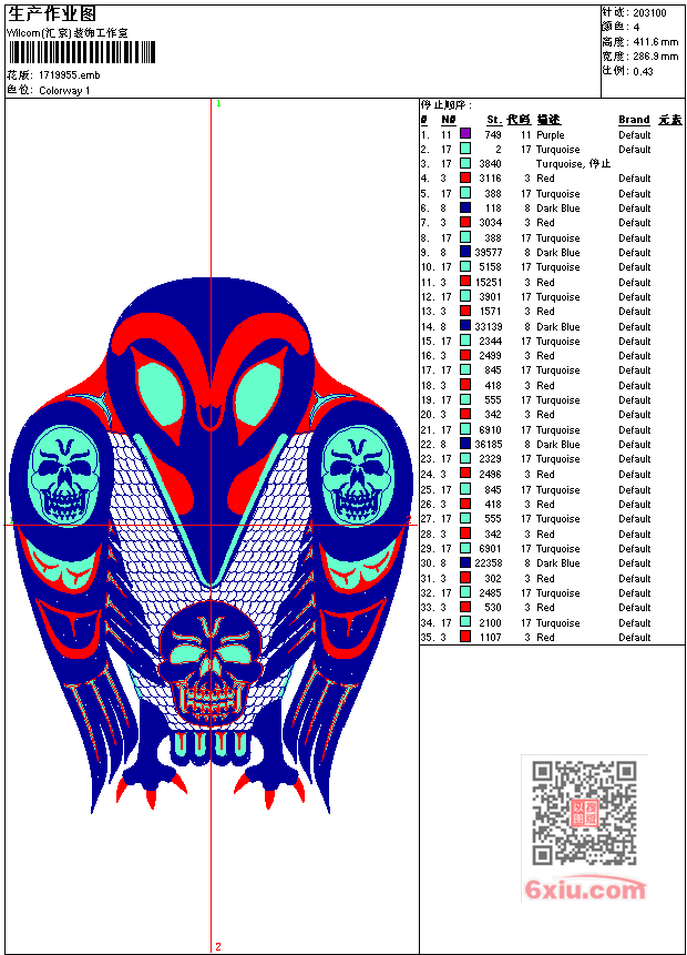 骷髅标 点此上传花版兑乐绣币/现金 emb花版参数: 大小:560.00 KB / 尺寸:287*412[毫米] / 针数:203100针 / 线色:4 / 格式:emb / 版本:6 版带文件需绣花软件方可打开,可配色打印导出各种格式或直接上机绣。如无绣花软件可下载1:1模拟效果图。 PNG图片信息:大小:2.2 (MB) /图宽*高:1086x1558(像素) 上传作者( cylc*** ) 获得乐绣币:10个 emb下载 1:1图下载 关闭 相似花型推荐: 蜥蜴卡通 王冠贴标 subaru车标 Bosch标 鲨鱼卡通 菩萨-精品-佛 阿弥陀佛-如来-精品 精品花瓶-牡丹花 笑世篇-字画精品 斯巴鲁subarul车标 曲棍球标 牛马卡通 熊卡通 马 武士标 上一个花样:骷髅 下一个花样:蜥蜴卡通