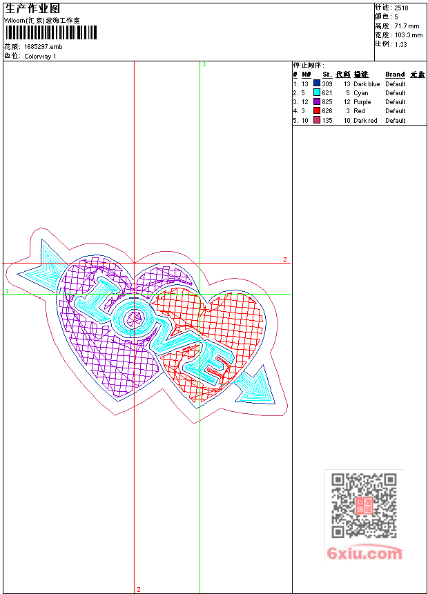 - emb花版参数: 大小:31.50 KB / 尺寸:103*72[毫米] / 针数:2518针 / 线色:5 / 格式:emb / 版本:9