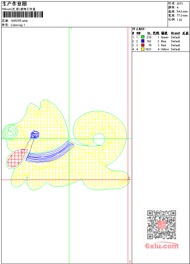 - emb花版参数: 大小:25.50 KB / 尺寸:77*55[毫米] / 针数:2073针 / 线色:4 / 格式:emb / 版本:9